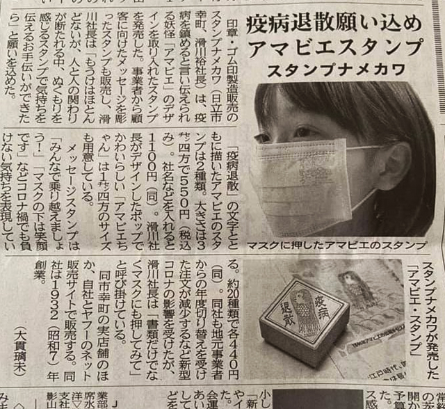 疫病退散願い込めアマビエスタンプ【茨城新聞】掲載 メディア掲載 2020.05.21 5月21日【茨城新聞】にてアマビエスタンプの記事が掲載されました。 小さなスタンプですが、手で捺すハンコだからこその「温もりの伝わる想い」が少しでも皆さんを癒せたら嬉しく思います。