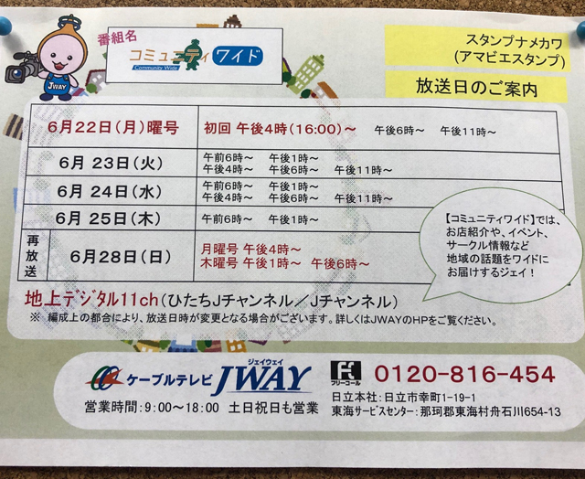 【コロナ退散スタンプ】J-WAYで放送! お知らせ 2020.06.22 2020年6月22日(月)から ケーブルテレビJ-WAYのコミュニティワイド番組内で当店の【コロナ退散スタンプ】がご紹介されます。 みんな見てね~!