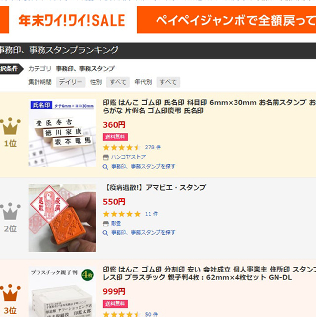 ヤフーショッピングでランキング2位【アマビエ・スタンプ】 ゴム印 2020.12.14 皆さん、年賀状のご準備は進んでますか? 来年2021年は「うし歳」です・・・が、今年は特別ですね。 ここへきて【アマビエ・スタンプ】が年賀はがき捺印のご用途で再ブレーク中。 昨日のヤフーショッピング・事務スタンプ部門で、なんとランキング2位まで浮上中🤩 疫病退散!のご利益がありますように、全国の皆様へ想いを込めてお届けしています。
