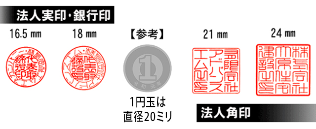 会社実印・銀行印のサイズは16.5ミリ、18ミリが多く使用されております。 実印・銀行印の併用は危険性が高く、実務上も障害が多いので、設立時に別々に作成されることをお奨めします。その場合、サイズをかえて区別がつきやすくすると良いでしょう。(材質・書体などをかえても良いですね)